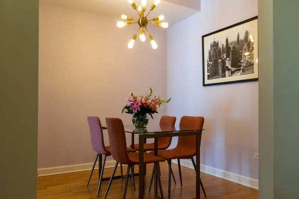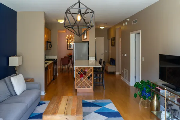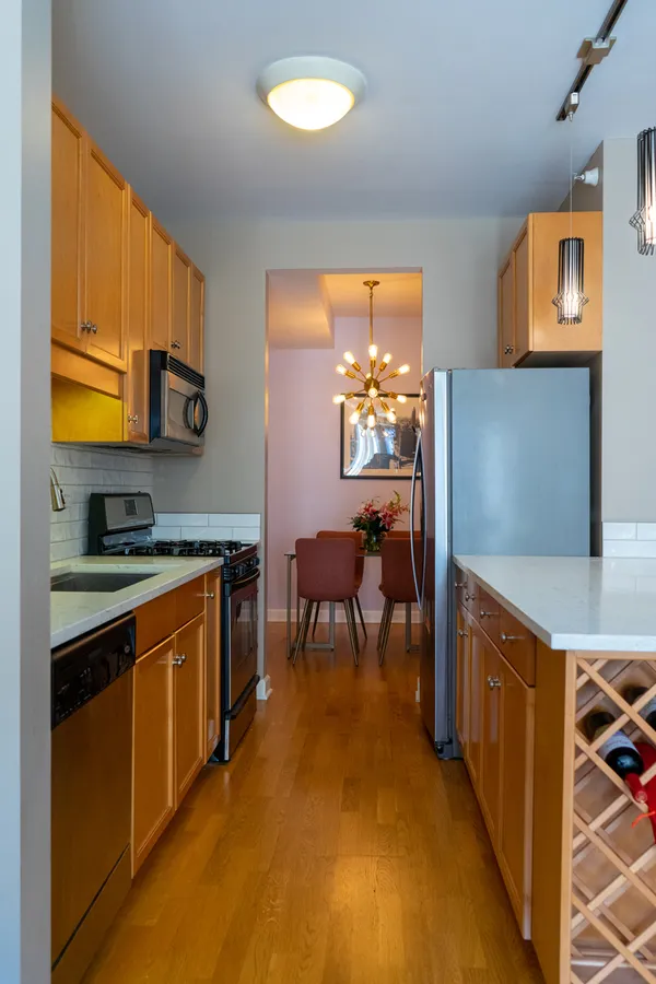 This one-bedroom unit features an open floor plan with hardwood floors, a newly upgraded kitchen with quartz countertops, backsplash, deep sink stainless steel appliances, and additional room for dining or office space. The bedroom has a walk-in closet large bathroom with double sinks-washer and Dryer in the unit. Enjoy a balcony that spans the width of the apartment overlooking a landscaped garden with south views. Deeded tandem parking available for only 27K! Full amenity building with 24hr doorman. The location is a short distance to public transportation, Trader Joe's, Jewel Osco, and FFC gym in the heart of the South Loop!